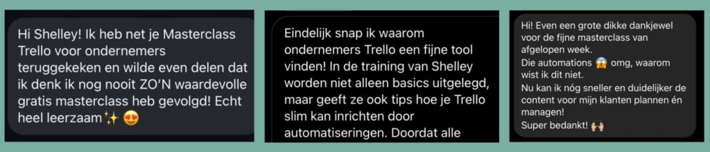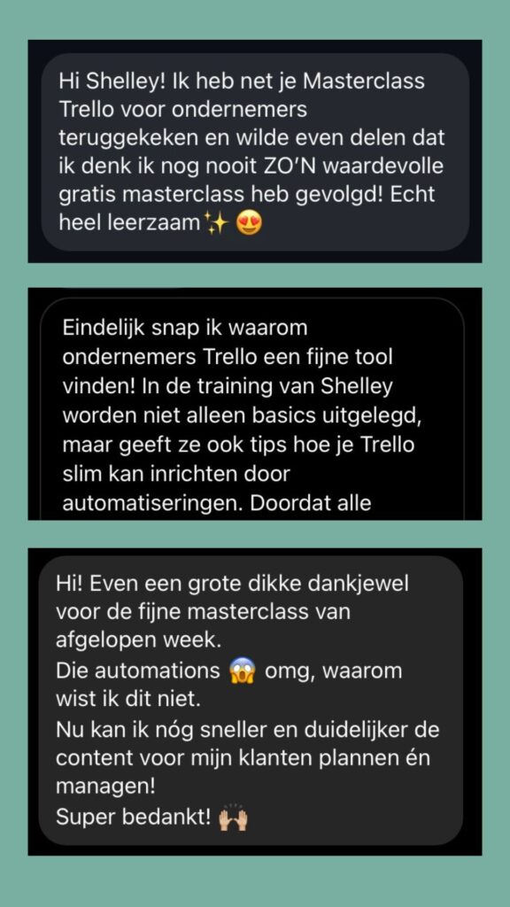 “Vroeger werkte ik graag met ClickUp. Tot ik door Shelley de wondere wereld van Trello ontdekte. Naast dat ik business coach ben, ben ik ook een echte IT nerd en automatiseringsexpert. Ondanks mijn nerdy achtergrond heb ik echt zoveel van deze topper mogen leren! Shelley weet namelijk echt ALLES over Trello. En dan niet alleen de standaard dingen. Ik bedenk altijd hele gekke automatiseringen om tijd te besparen, ook binnen tools. Zelfs voor mijn meest wilde ideeën heeft zij een passende oplossing bedacht. Ze is voor mij een echte Trello Pro!”